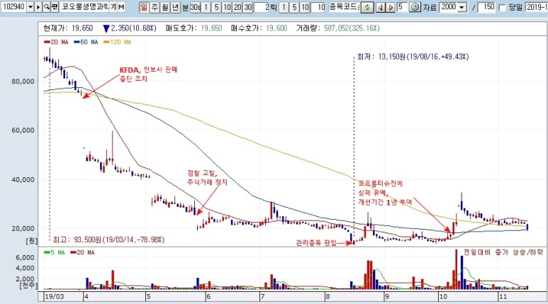 이었던 주가가 인보사의 실체가 드러나면서 끝 없는 추락.