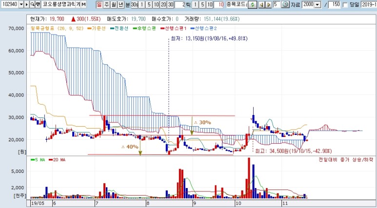 - 주력 상품의 붕괴 : Bio업종의 성장 전망에 힘입어 한때(2015/07) 300,000원, 금년 1월 90,000원