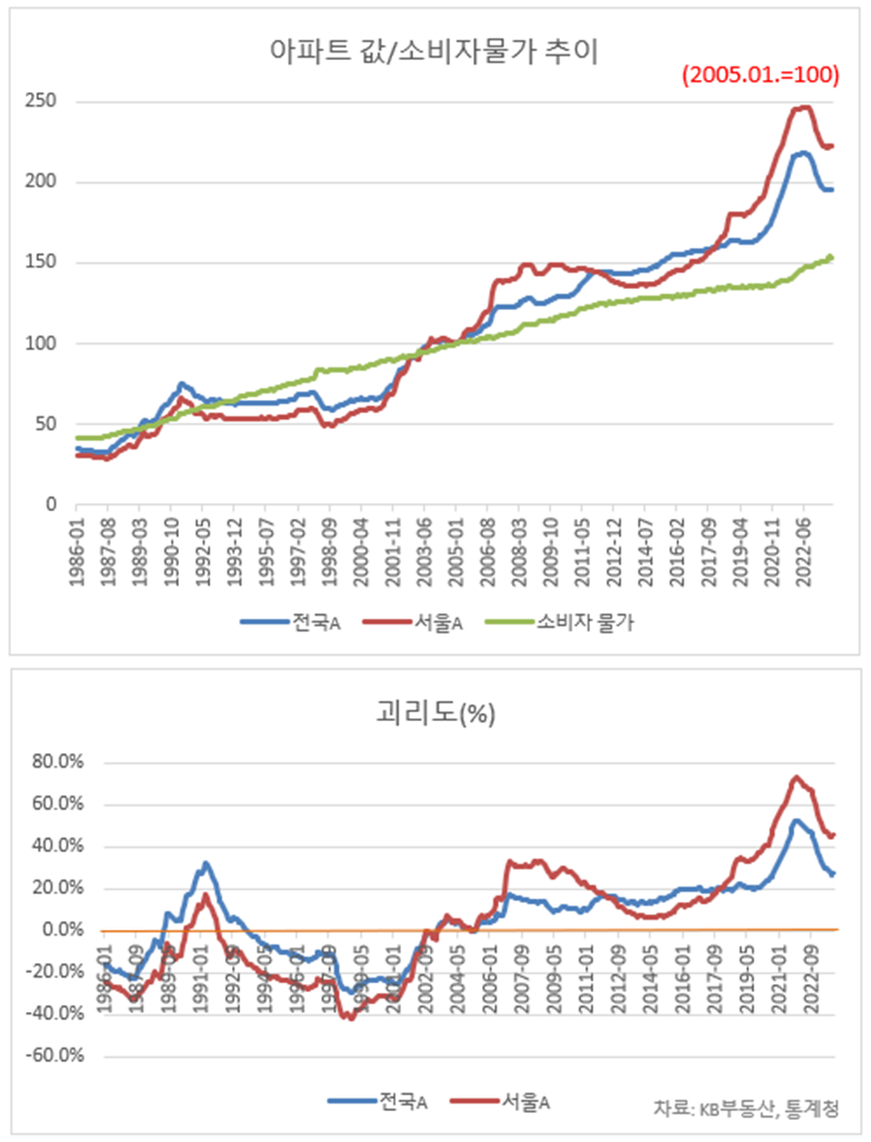 한편 2022년부터 하락하기 시작한 아파트값은 장기추세선 쪽으로 하방 수렴하고 있는 중이다. 미래에 나타날 시장가격은 물론 적정수준 근접이나 저점 도달 시기를 미리 안다는 것은 불가능하다.