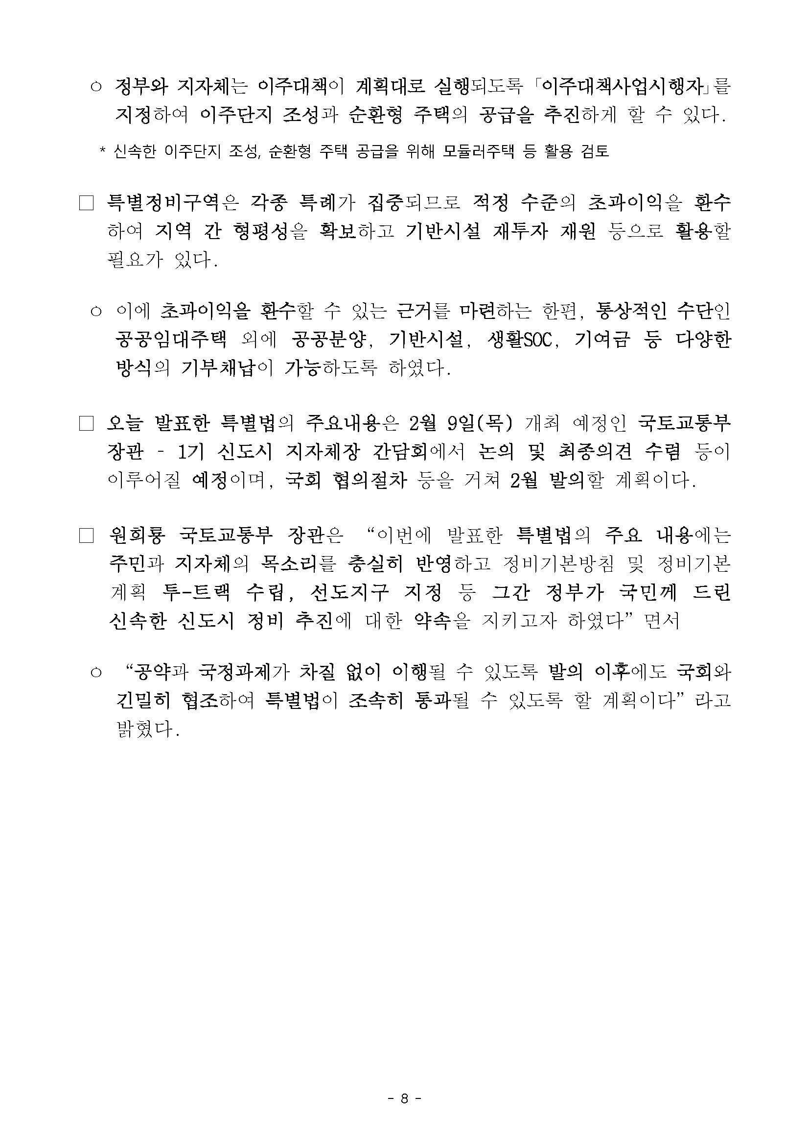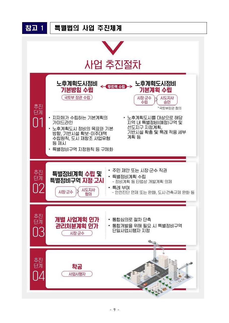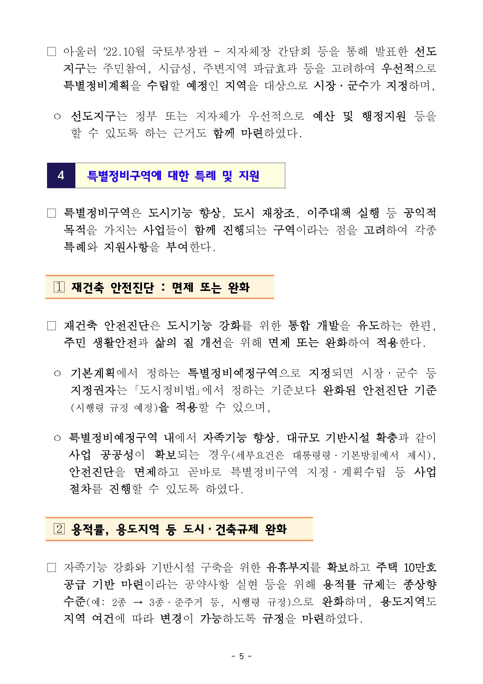 • (기본방침) 모든 노후계획도시에 보편적으로 적용되는 가이드라인으로 계획수립·구역지정 원칙, 특별정비구역 내 추진사업 유형 제시(국토부)