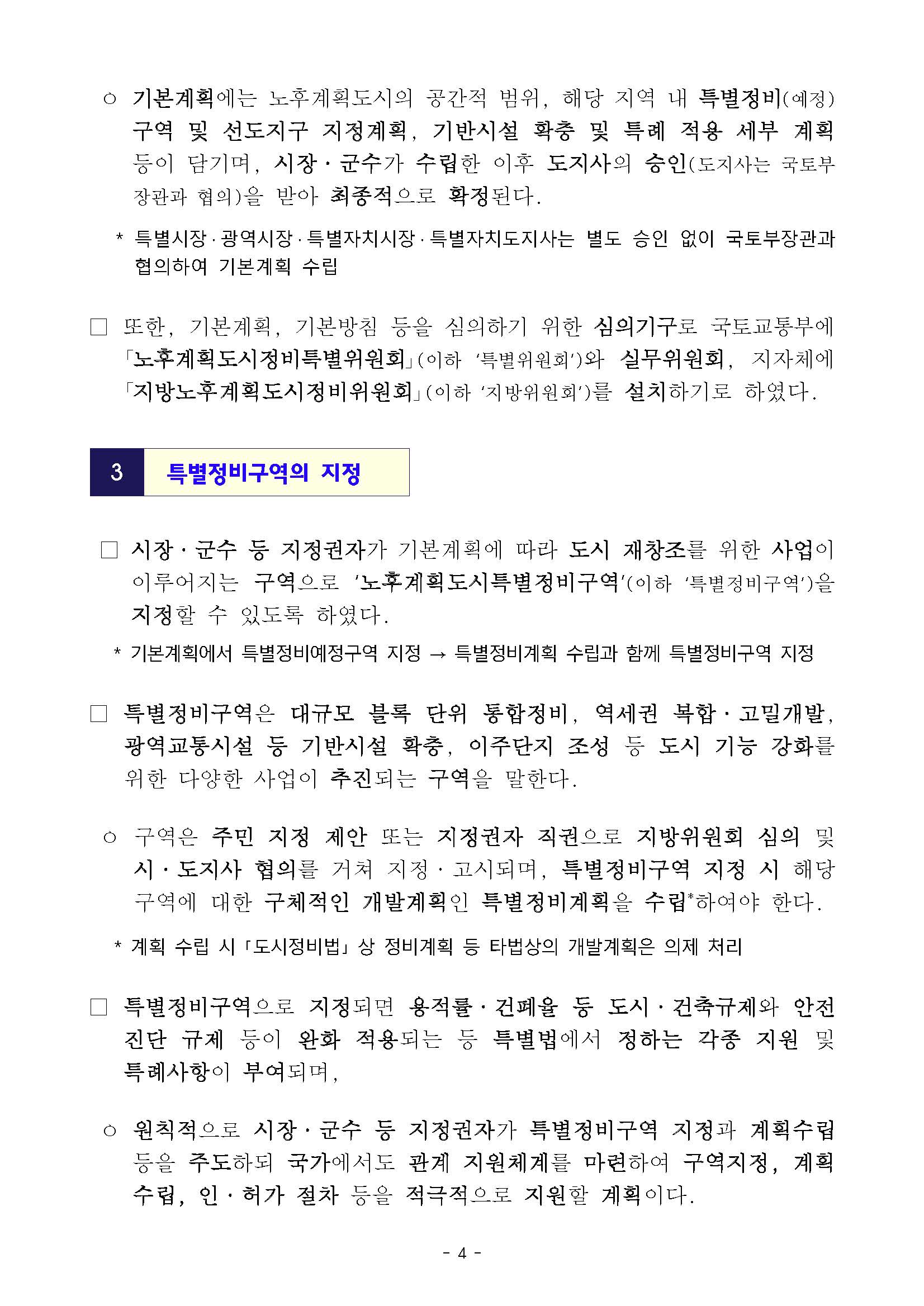• (기본계획) 특정 노후계획도시를 위한 도시정비 총괄계획으로 구역지정 세부계획, 기반시설 확충 및 특례 적용사항 등을 포함(지자체)