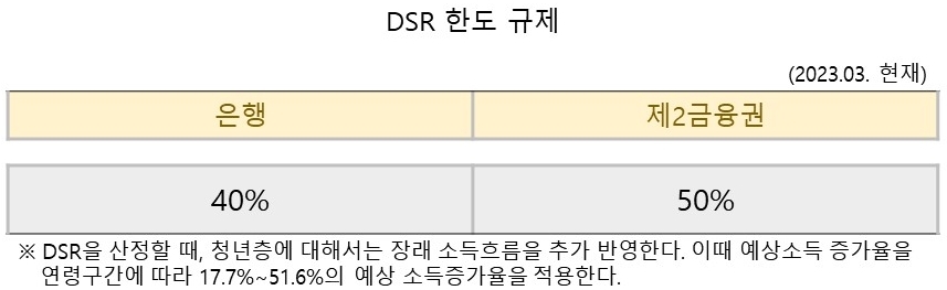 이 DSR규제는 주택 뿐만 아니라 모든 용도의 대출에 적용된다. 하지만 신규대출 금액이 1억원 미만일 경우에는 적용하지 않는다.